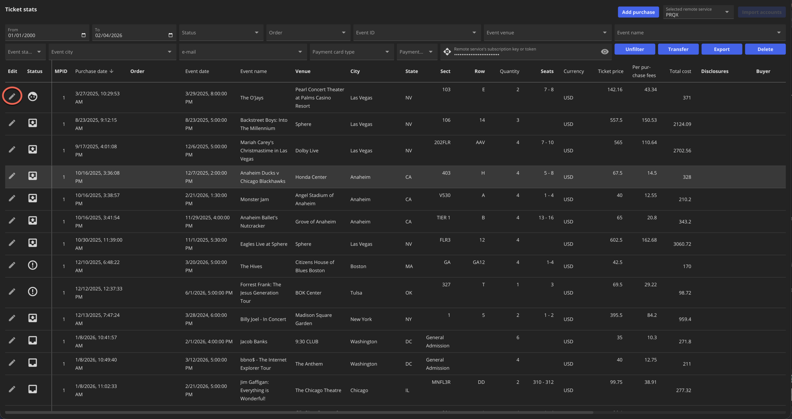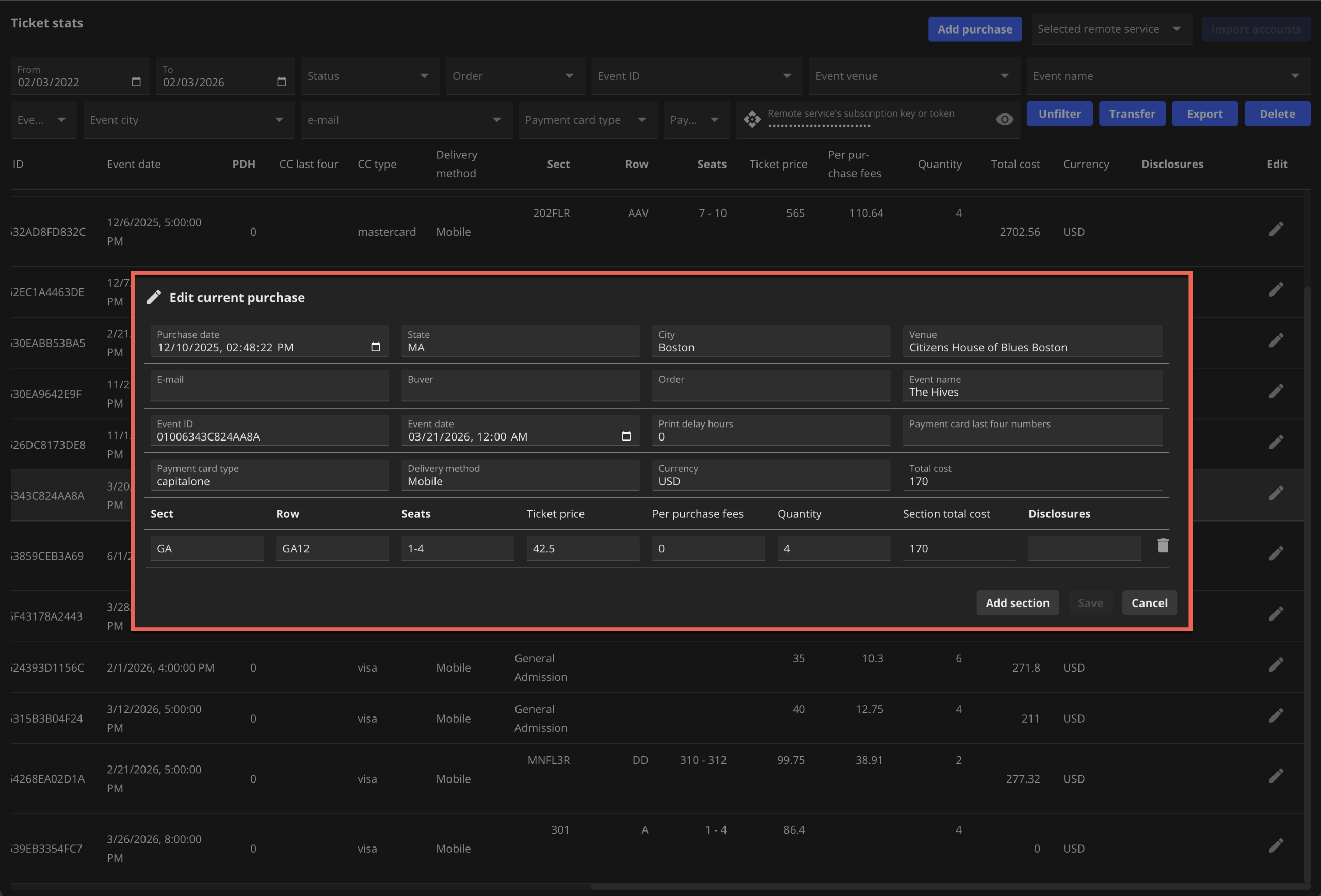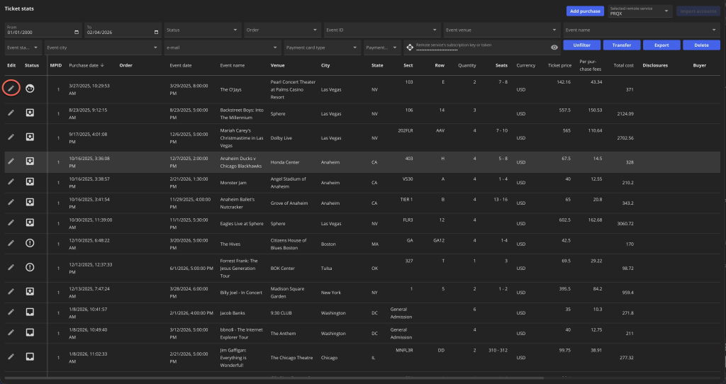 You can now edit all purchase details, which is especially helpful since Insomniac Browser Purchase Tracking can sometimes pull incorrect info or no info at all for General Admission shows where section, row, and seat numbers aren’t available on the confirmation page.