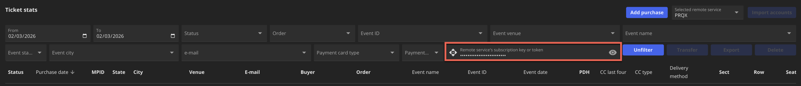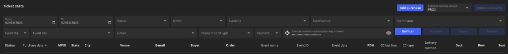 On the “Ticket stats” page there are various filters, that could be used in order to show only purchases, which match specific multiple parameters. The “Unfiler” button removes all applied filters with the exception of the “From” and “Too” calendar inputs and shows all purchases for the chosen time frame. The “Export” button exports shown purchases into CSV file.